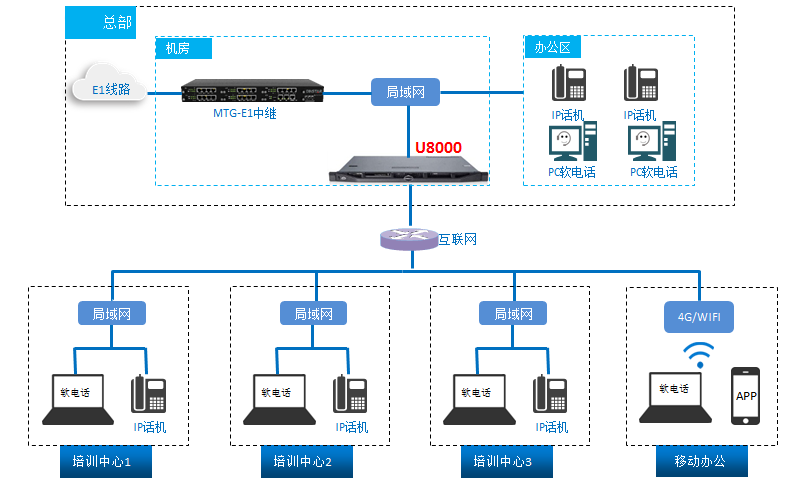 1.集團共用一套系統, 統一通信,穩定可靠,系統最大可擴容10000用戶接入。 硬件采用戴爾雙至強高配服務器,UC8000軟件灌入其中,方便客戶未來再次擴展。 2.一號多機, 一個分機授權,可以在同一個員工的IP話機、手機端、電腦端同時登陸使用。 3.分支互聯, 不借助企業內部的VPN網絡,也可實現異地的多分支組網,內部通訊費用全免。 4.實時錄音存儲, 以及錄音備份,可快讀調取錄音。